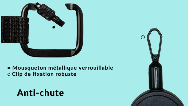 Le mousqueton verrouillable vous permet d’attacher le cordon à n’importe quel